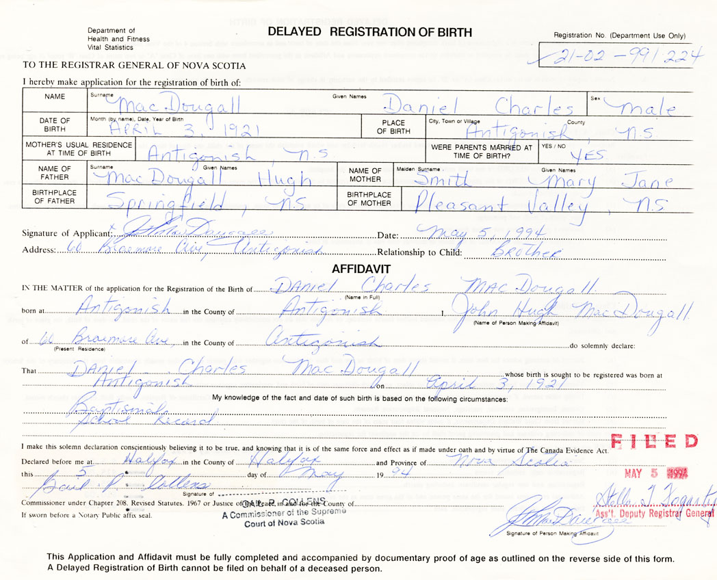 Date of Birth April 3, 1921 Place of Birth AntigonishCounty of Antigonish
