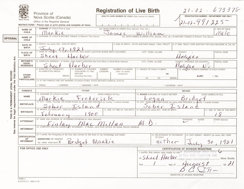 Date of Birth July 17, 1921 Place of Birth Sheet HarbourCounty of Halifax