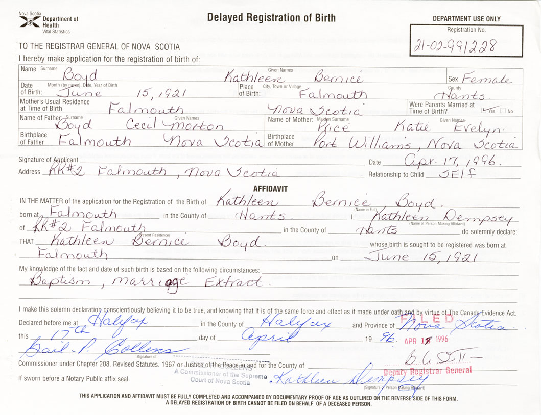 I hereby make application for the Registration of Birth of Kathleen BerniceBoyd Sex Female