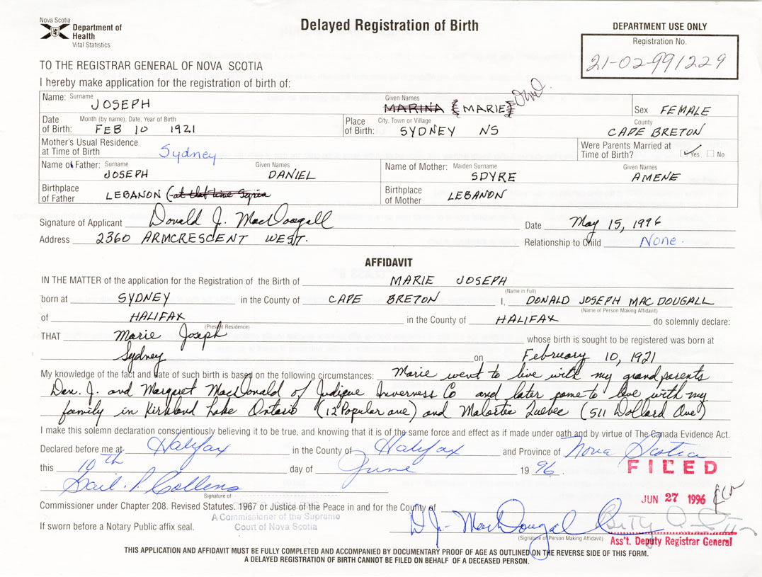 Marie went to live with my grandparents Dan J. and Margaret MacDonald of Judique, Inverness and later came to live with my family in Kirkland Lake Ontario (12 Popular Ave.) and Malortic, Quebec (511 Dollard Ave)