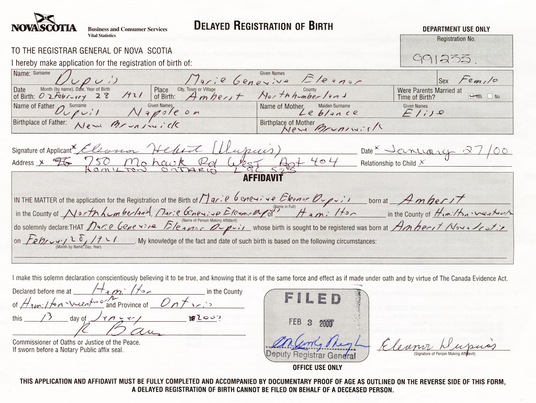 I hereby make application for the Registration of Birth of Marie Genevive EleanorDupuis Sex Female