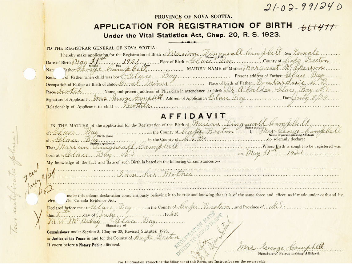 I hereby make application for the Registration of Birth of Marion DingwallCampbell Sex Female