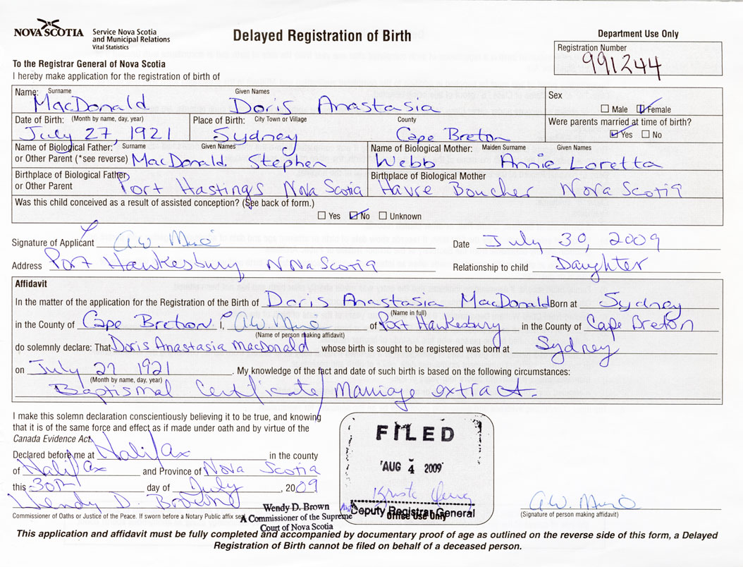 IN THE MATTER of the application for the Registration of the Birth of Doris AnastasiaMacDonald