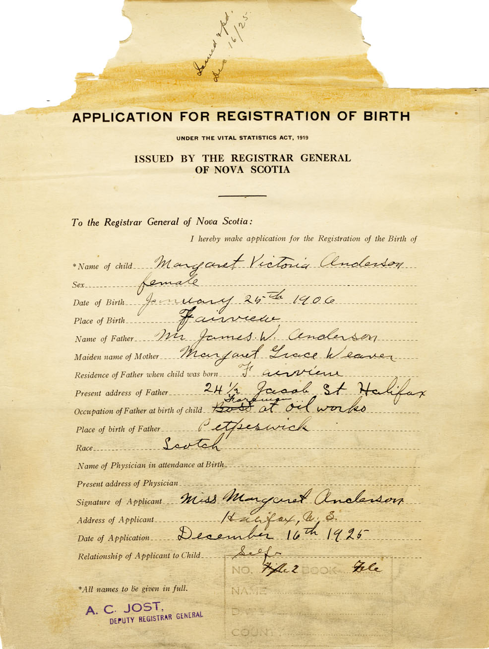 21. Name and Post Office address of Informant Margaret Anderson Halifax