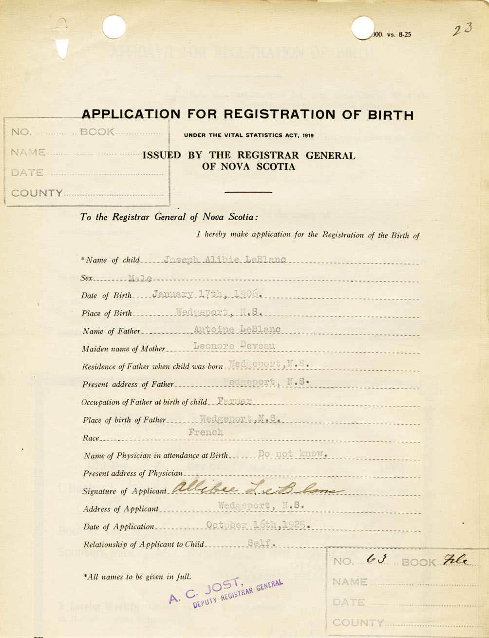 2. FULL NAME OF CHILD LeBlanc, Joseph Alibie