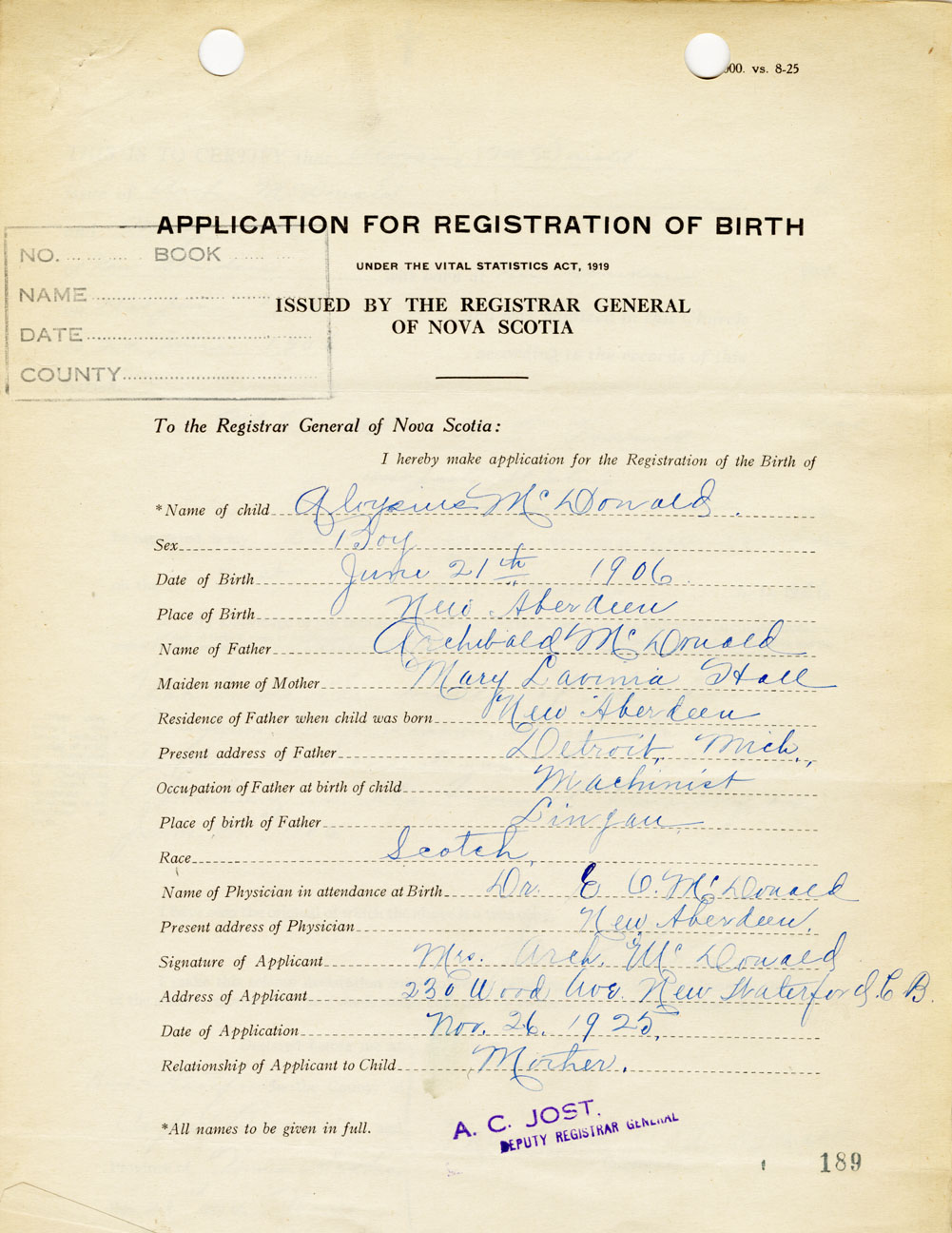 Date of Birth June 21, 1906 Place of Birth New AberdeenCounty of Cape Breton