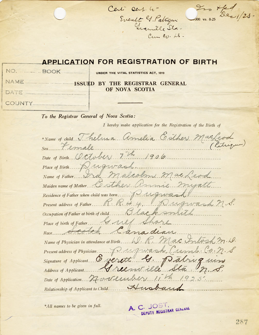 I hereby make application for the Registration of Birth of Thelma Amelia EstherMacLeod Sex Female