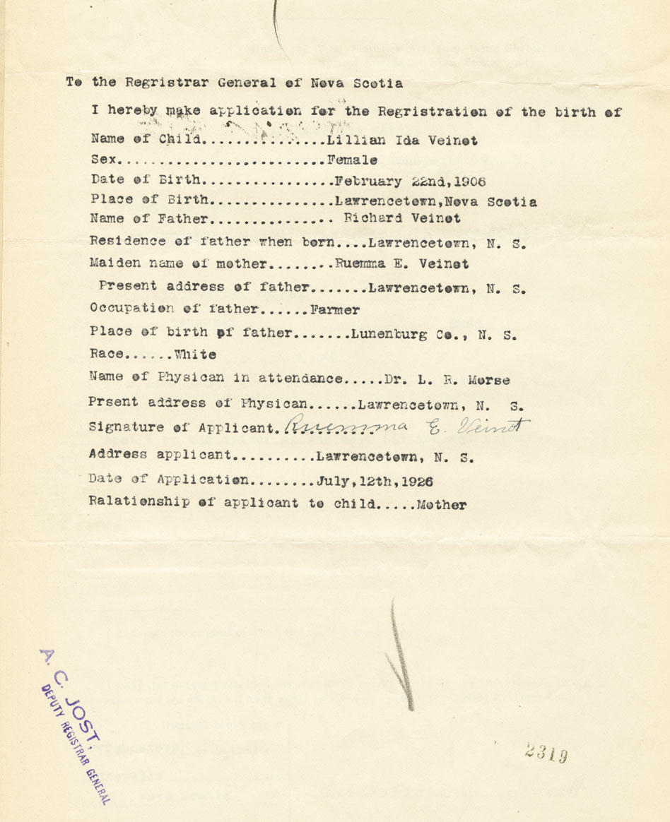 Signature of Applicant Ruemma E. Veinot Address of Applicant Lawrencetown Date 12 July 1926