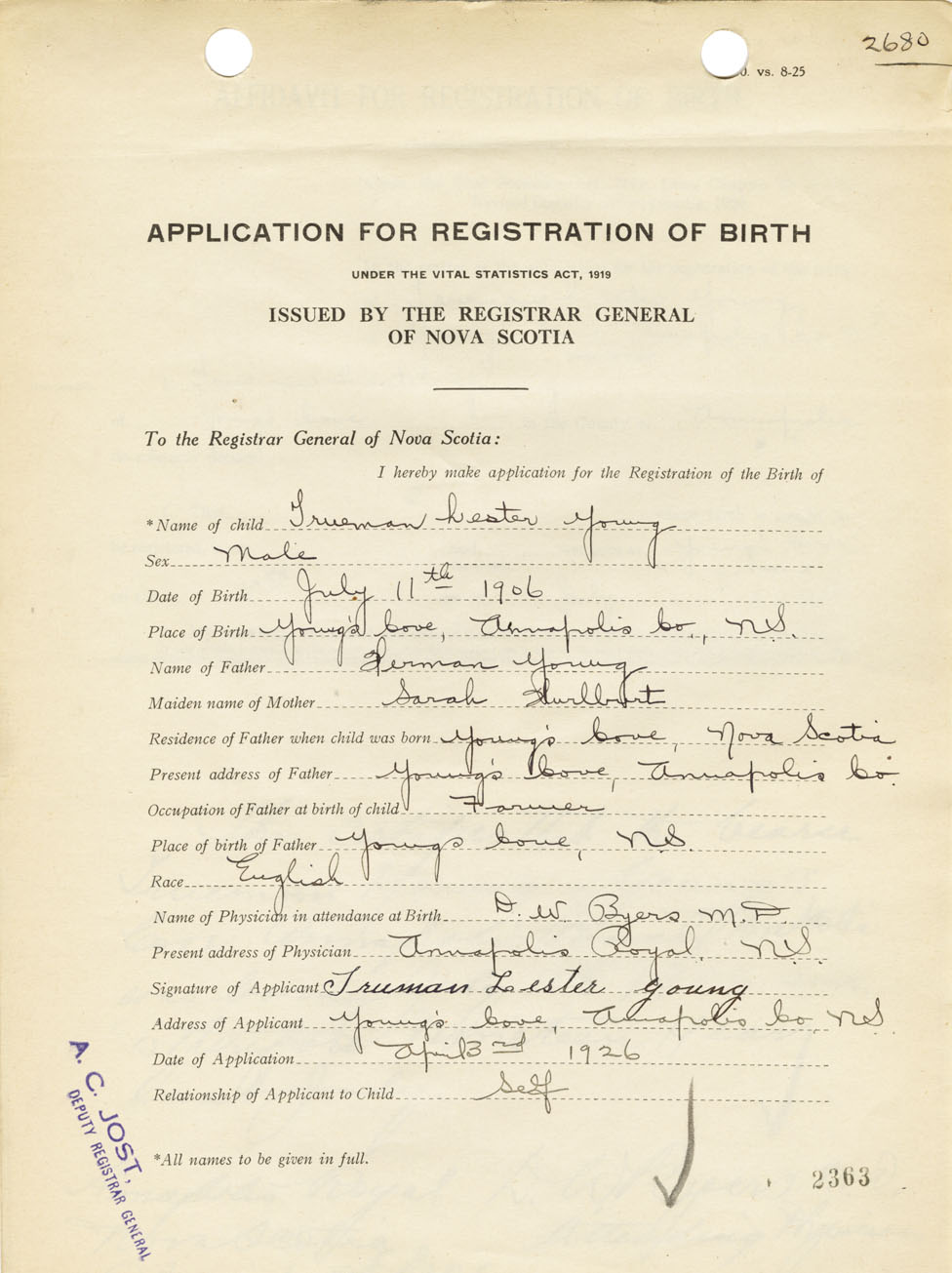 I hereby make application for the Registration of Birth of Trueman LesterYoung Sex Male