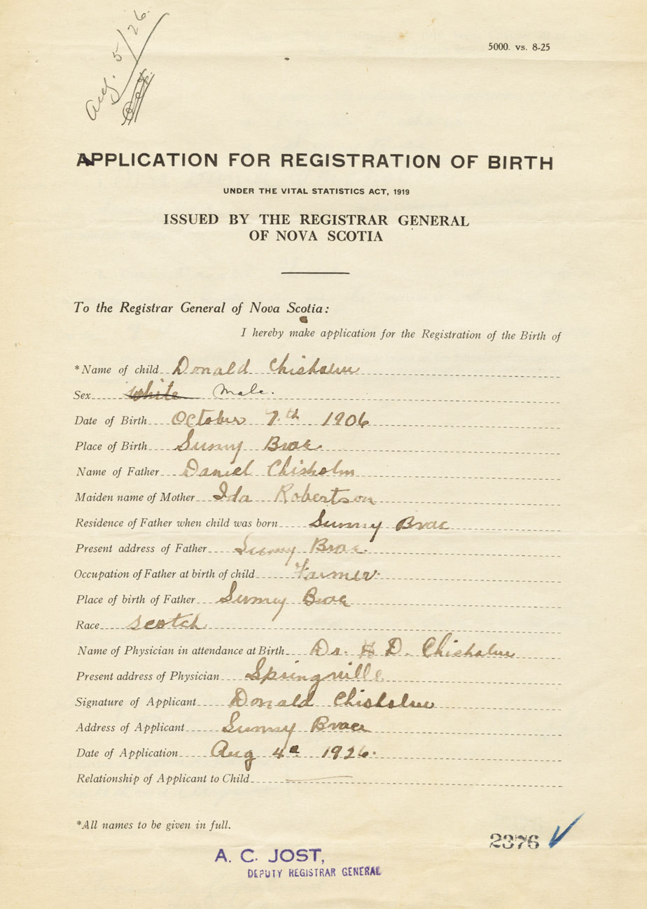I hereby make application for the Registration of Birth of DonaldChisholm Sex Male