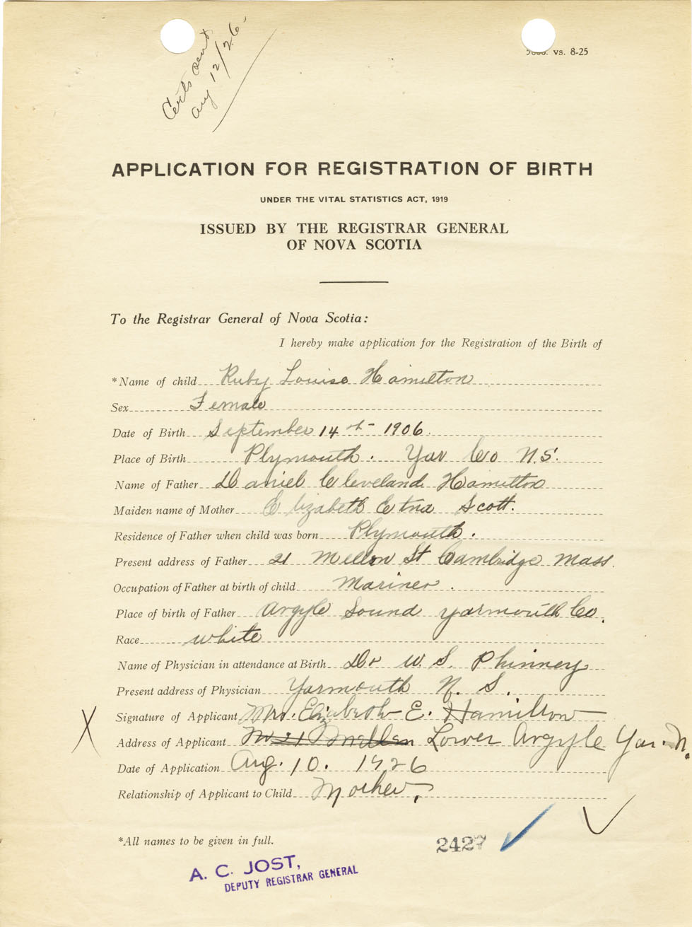 I hereby make application for the Registration of Birth of Ruby LouiseHamilton Sex Female