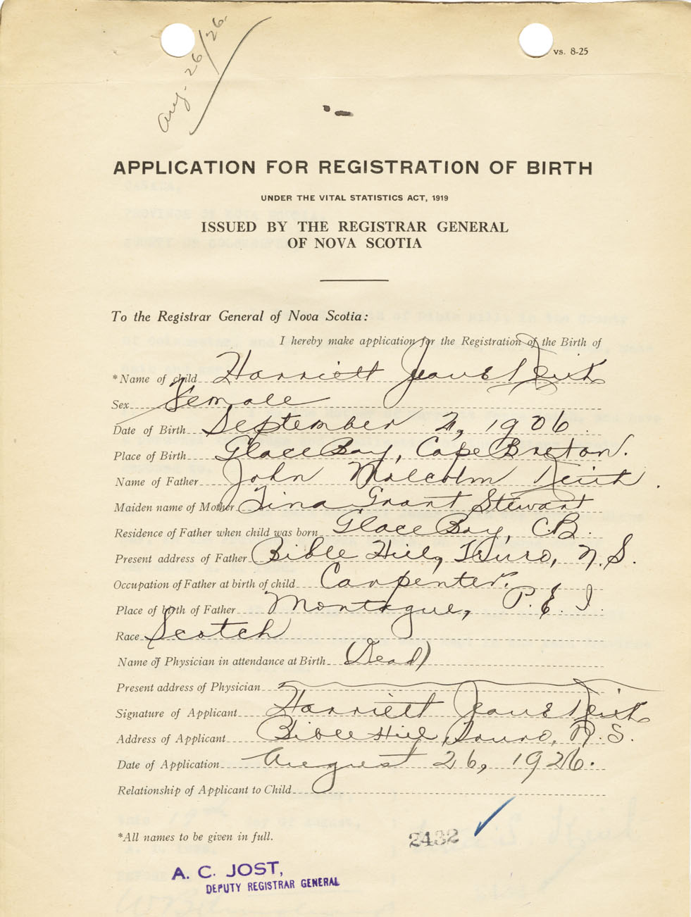 Signature of Applicant Harriett Jeane Keith Address of Applicant Bible Hill Date 26 August 1926