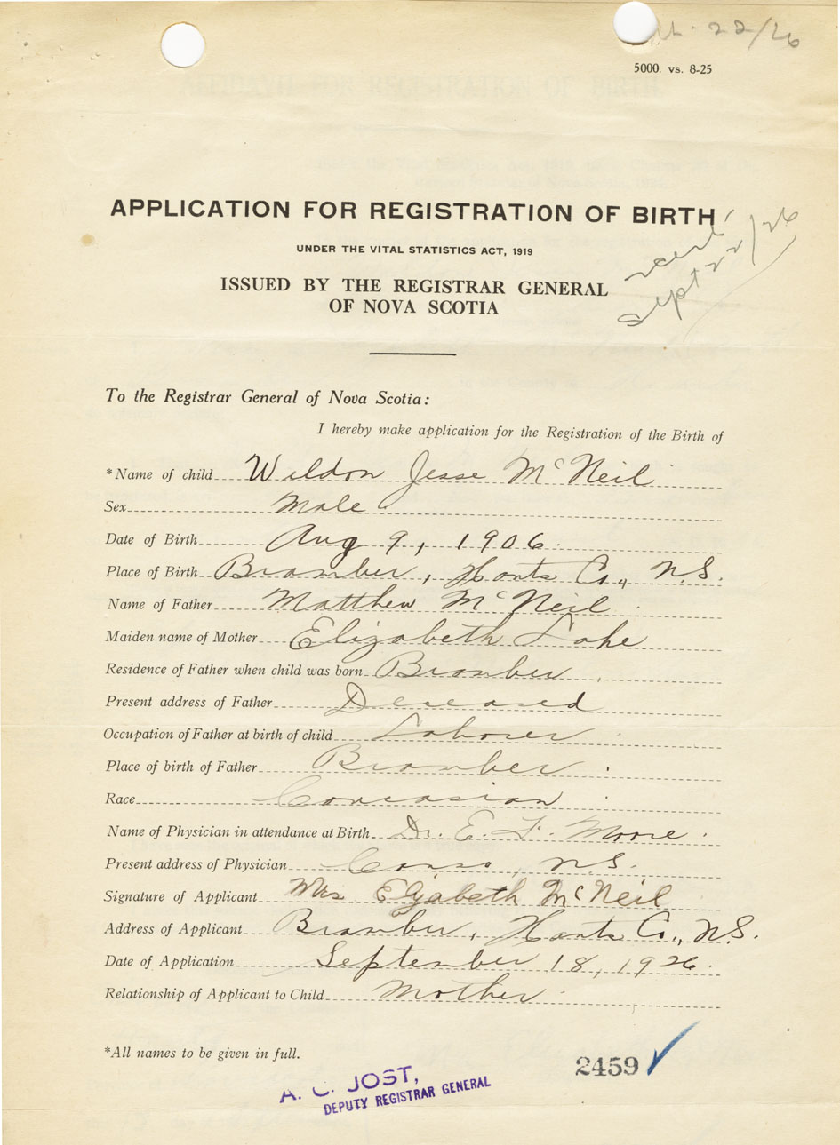 I hereby make application for the Registration of Birth of Weldon JesseMcNeil Sex Male