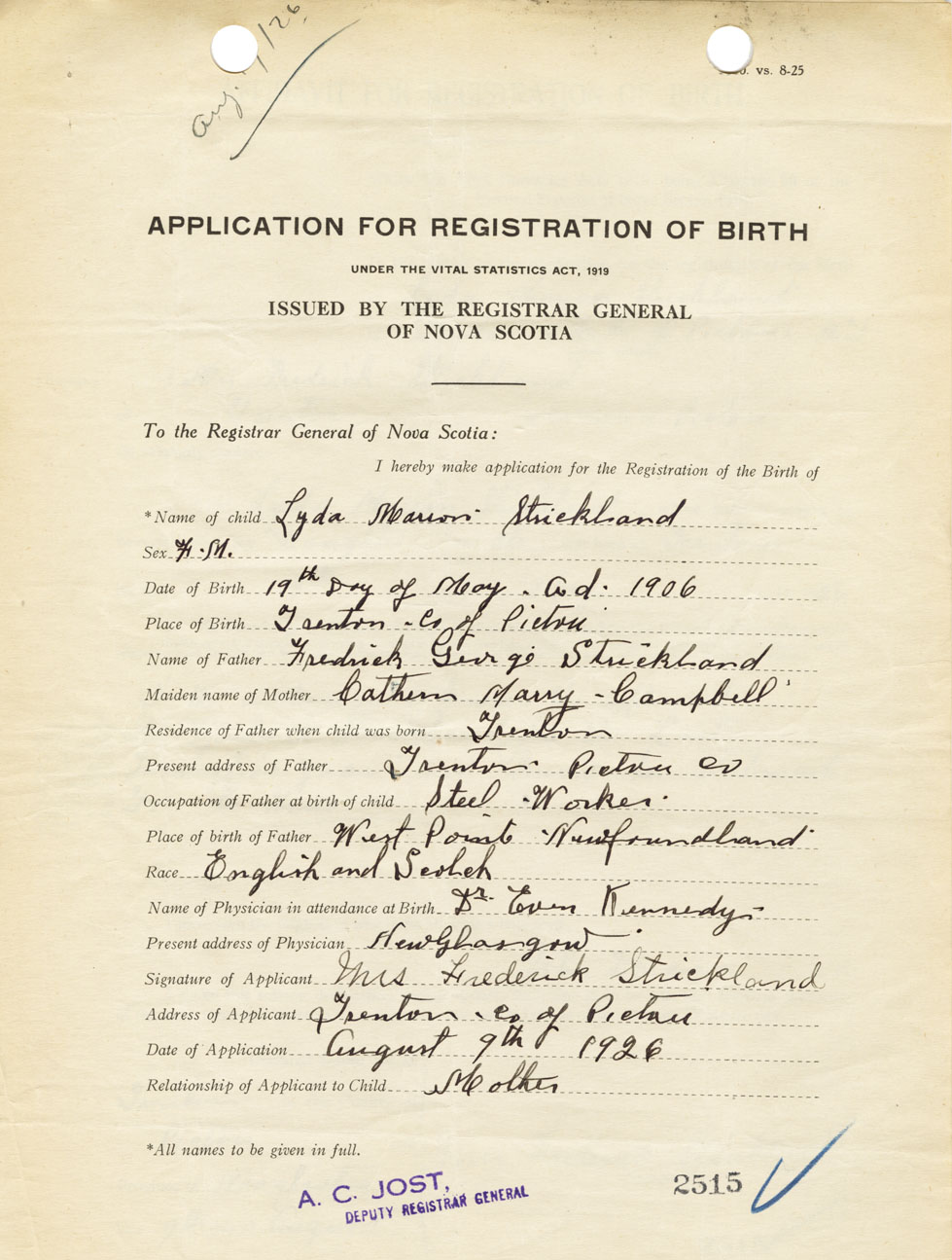 Date of Birth May 19, 1906 Place of Birth TrentonCounty of Pictou