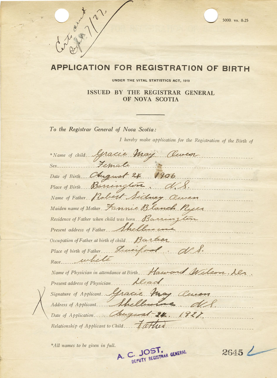 Date of Birth August 24, 1906 Place of Birth BarringtonCounty of Shelburne