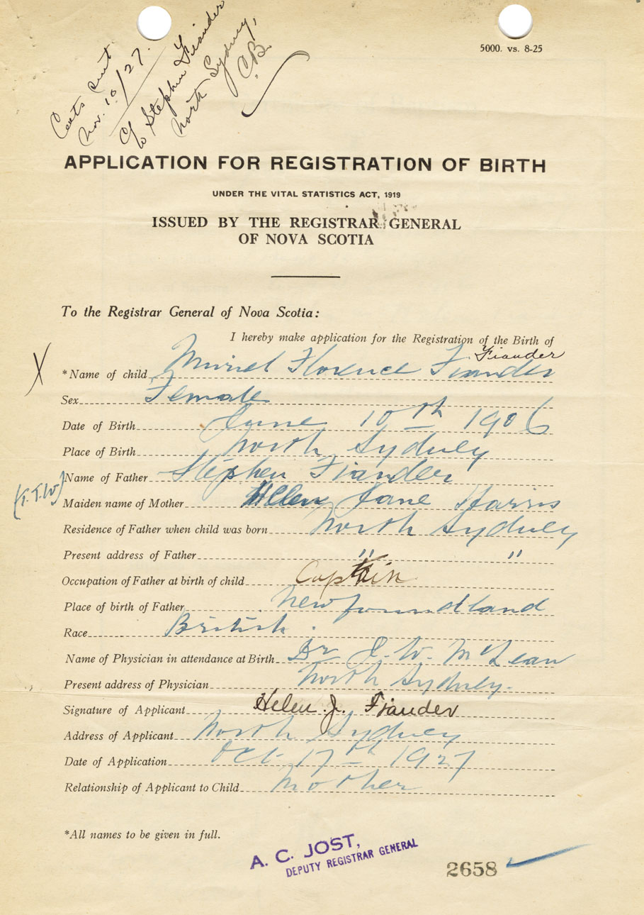 Date of Birth June 10, 1906 Place of Birth North SydneyCounty of Cape Breton
