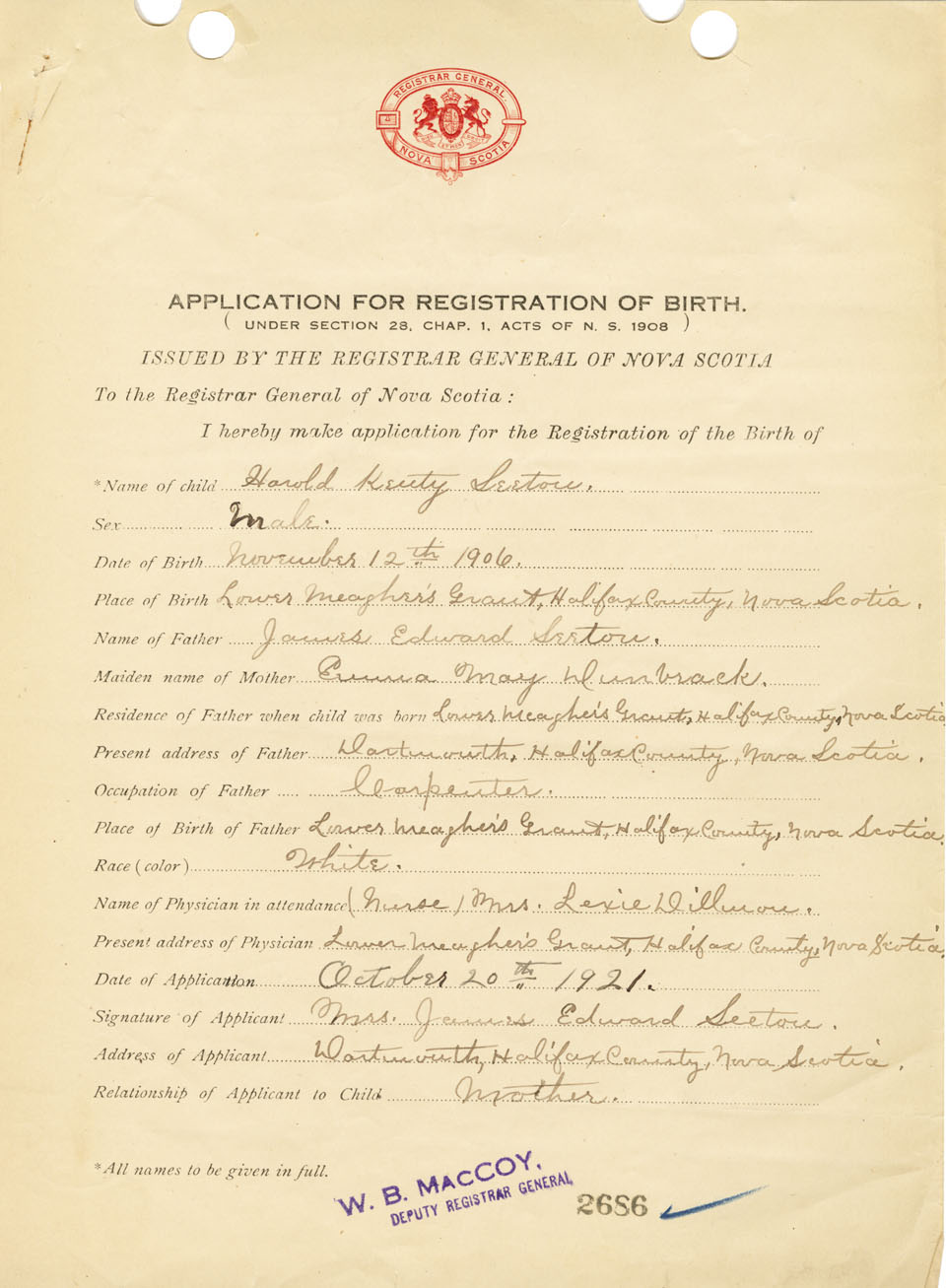 Date of Birth November 12, 1906 Place of Birth Lower Meaghers GrantCounty of Halifax
