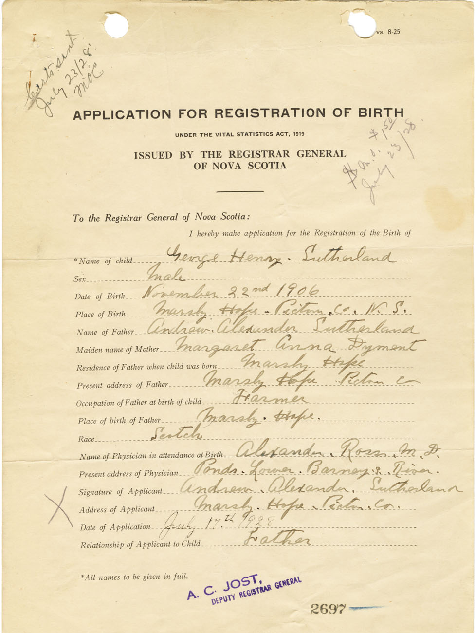 I hereby make application for the Registration of Birth of George HenrySutherland Sex Male