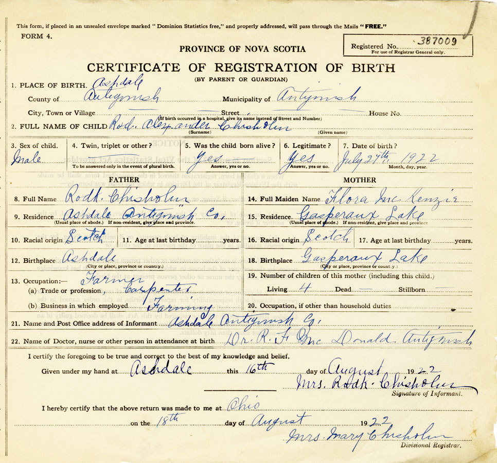 22. Name of Doctor, nurse or other person in attendance at birth Dr. R. F. McDonald, Antigonish
