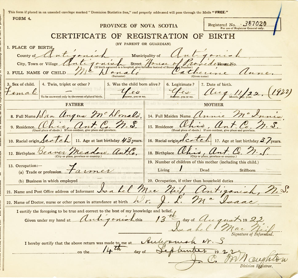 21. Name and Post Office address of Informant Isabel MacNeil Antigonish