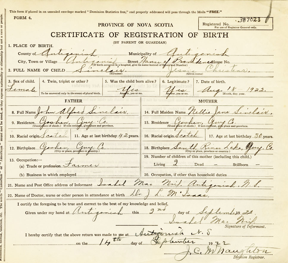21. Name and Post Office address of Informant Isabel MacNeil Antigonish