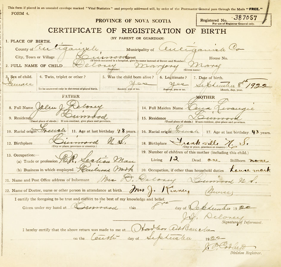 21. Name and Post Office address of Informant Mrs. D. Delorey Linwood, Antigonish