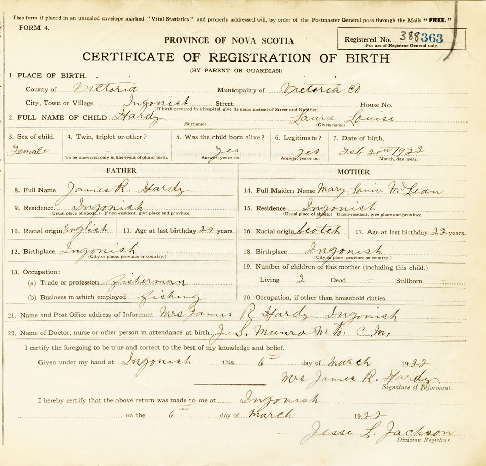 21. Name and Post Office address of Informant Mrs. James R. Hardy Ingonish, Victoria