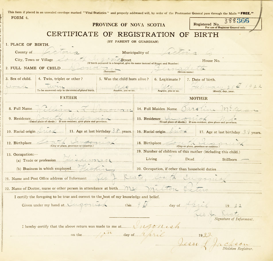 18. Birthplace South Ingonish, Victoria