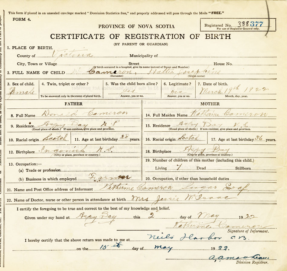 22. Name of Doctor, nurse or other person in attendance at birth Mrs. Jessie McIsaac