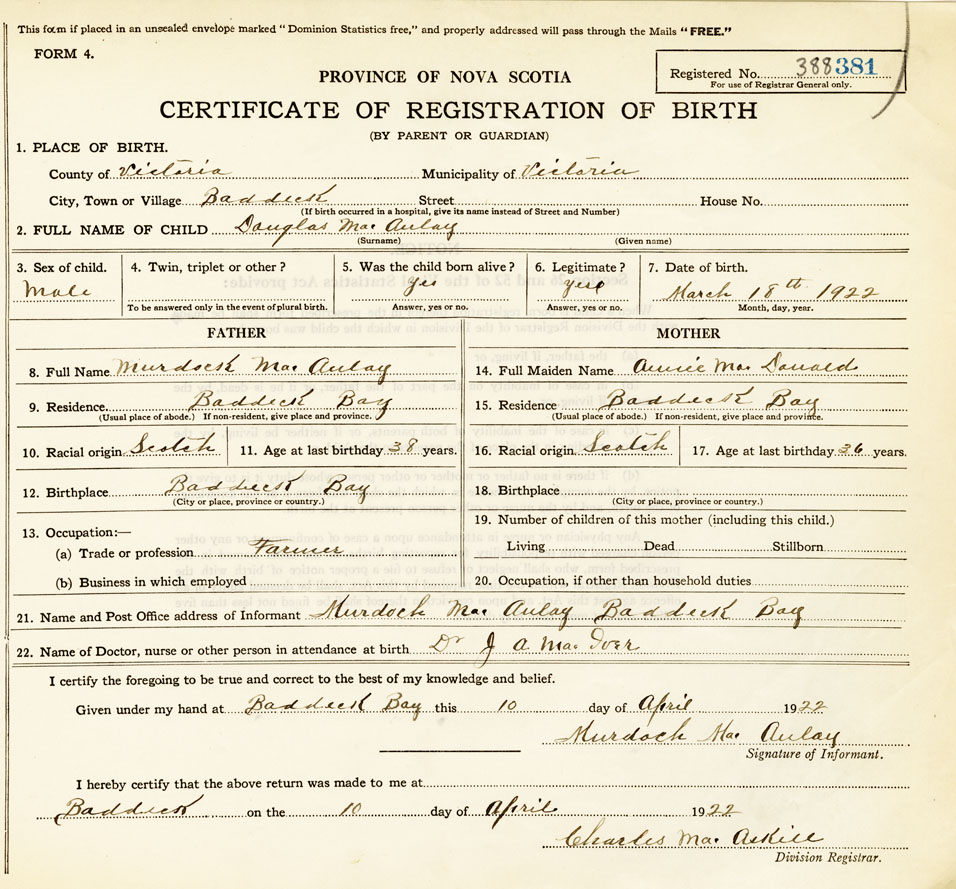 21. Name and Post Office address of Informant Murdock MacAulay Baddeck Bay