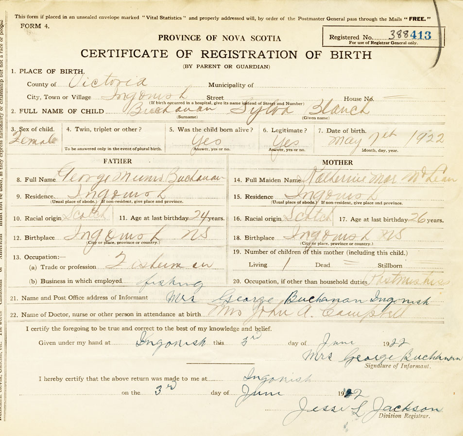 21. Name and Post Office address of Informant Mrs. George Buchanan Ingonish