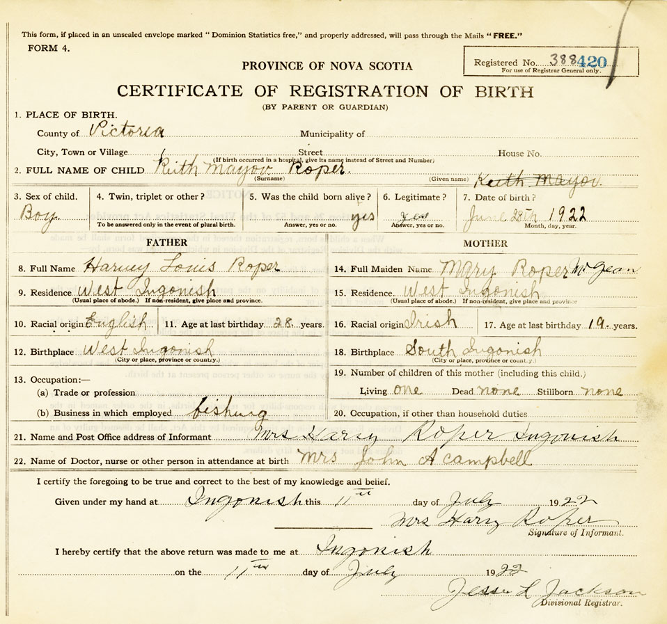 21. Name and Post Office address of Informant Mrs. Harry Roper Ingonish