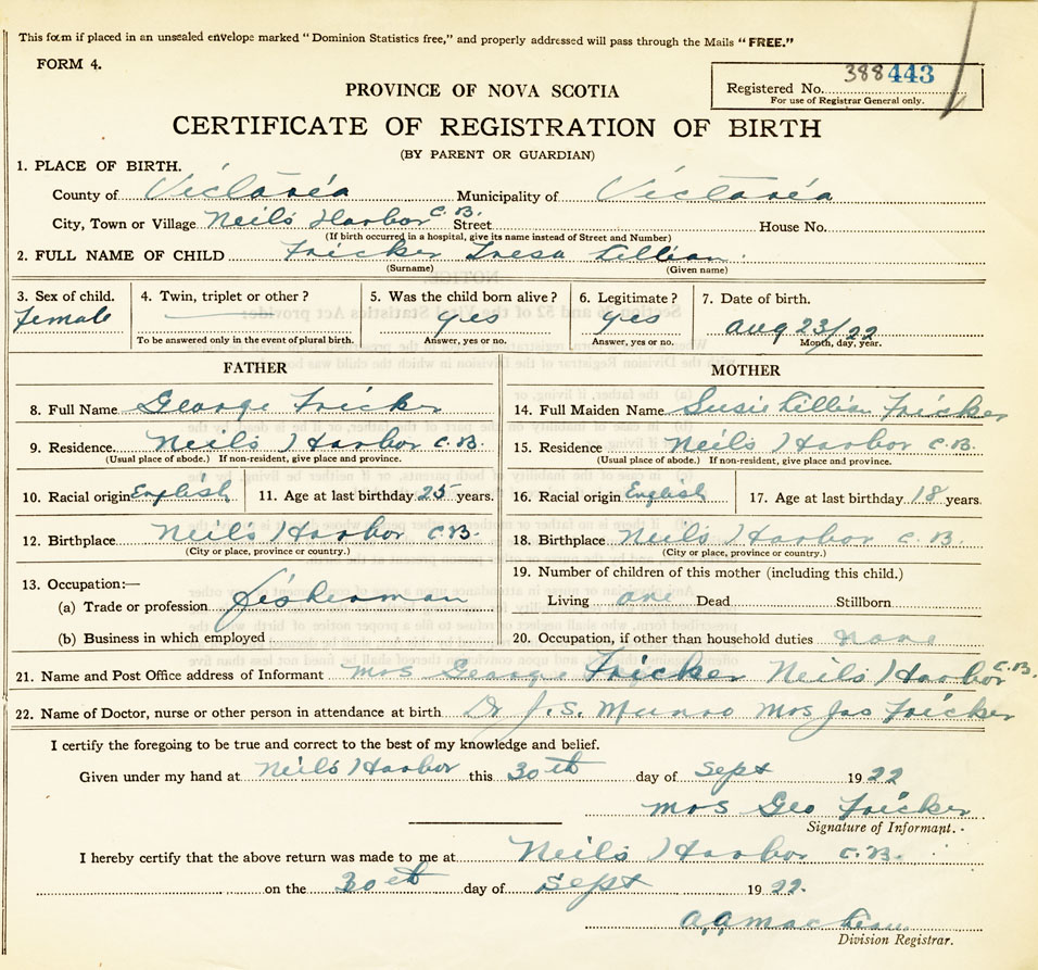 21. Name and Post Office address of Informant Mrs. George Fricker Neils Harbour