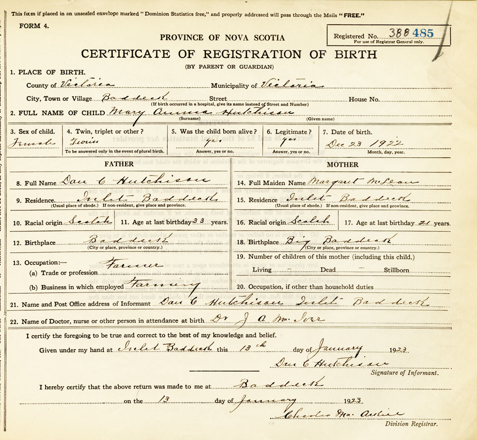 21. Name and Post Office address of Informant Dan C. Hutchison Inlet Baddeck