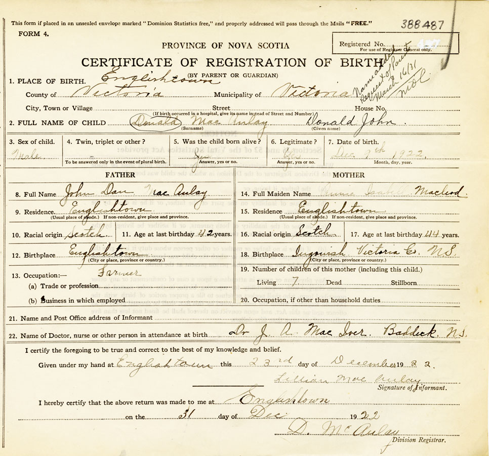 22. Name of Doctor, nurse or other person in attendance at birth Dr. J.A. MacIver