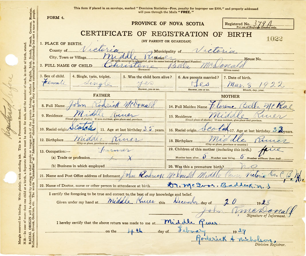 21. Name and Post Office address of Informant John Rodrick McDonald Middle River, Victoria N.S.