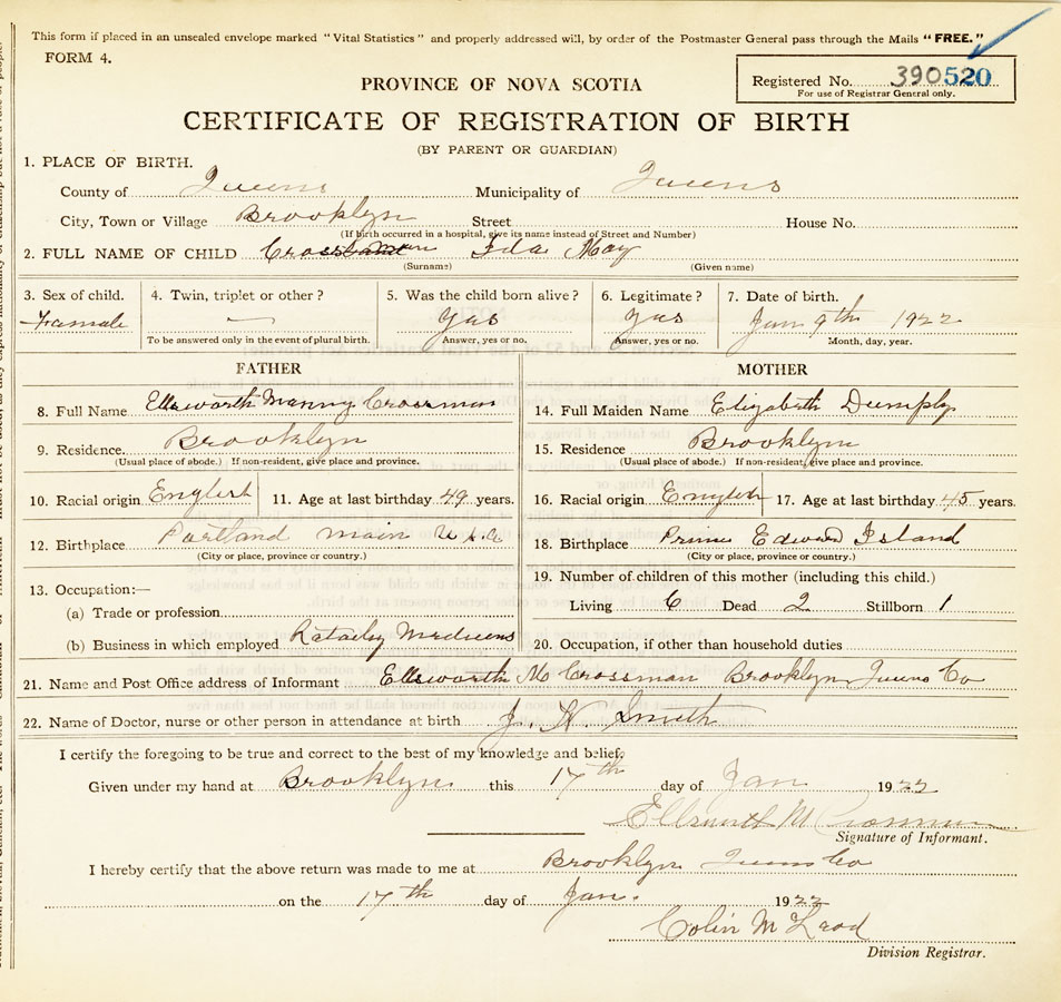 21. Name and Post Office address of Informant Ellsworth M Crossman Brooklyn, Queens