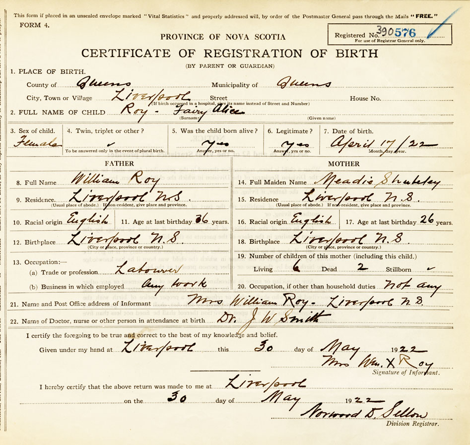 21. Name and Post Office address of Informant Mrs. William Roy Liverpool N.S.