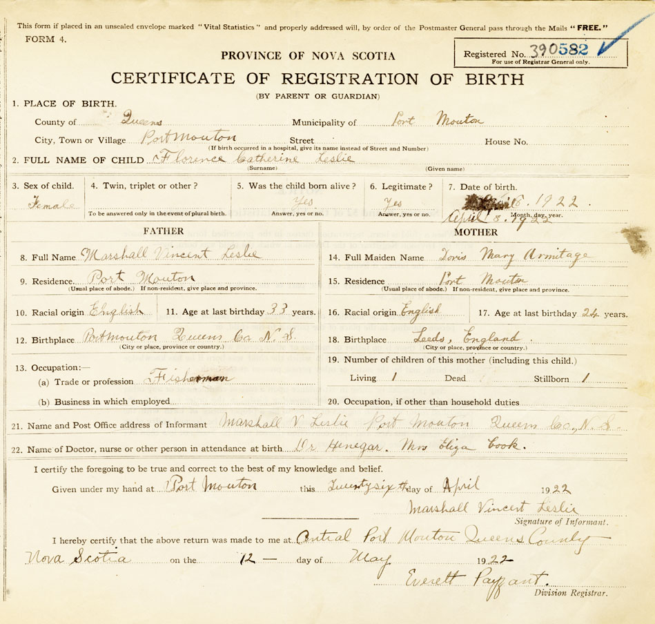 21. Name and Post Office address of Informant Marshall V Leslie Port Mouton Queens N.S.