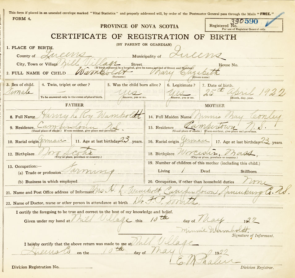 21. Name and Post Office address of Informant Mrs. H. L. Wambolt (sic) Camperdown, Lunenburg