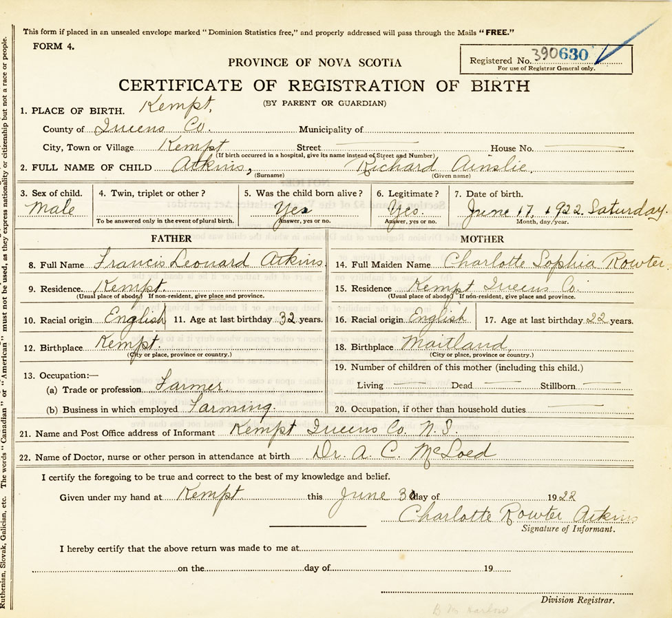 22. Name of Doctor, nurse or other person in attendance at birth Dr. A. C. McLoed