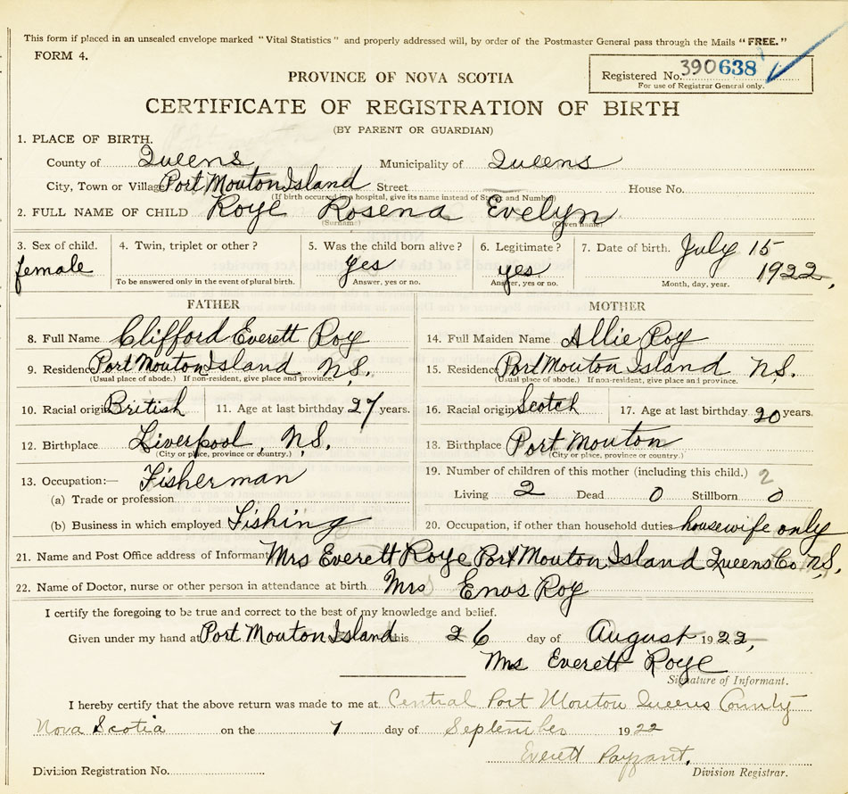21. Name and Post Office address of Informant Mrs. Everett Roye Port Mouton Island, Queens
