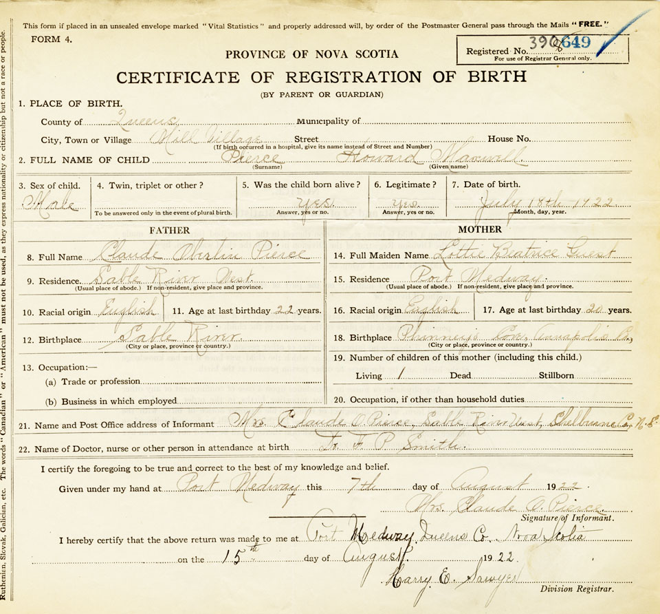 21. Name and Post Office address of Informant Mrs. Claude O. Pierce Sable River West, Shelburne County