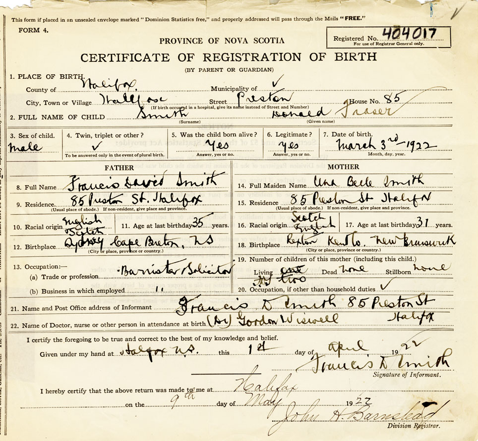 21. Name and Post Office address of Informant Francis D. Smith 85 Preston Street, Halifax