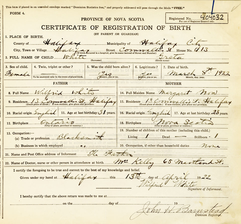 21. Name and Post Office address of Informant Wilfrid White 13 Cornwallis St., Halifax