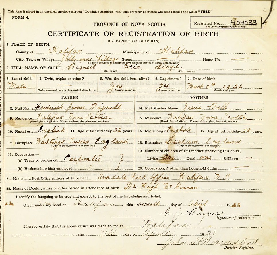 21. Name and Post Office address of Informant F.J. Bignell Armdale, Halifax
