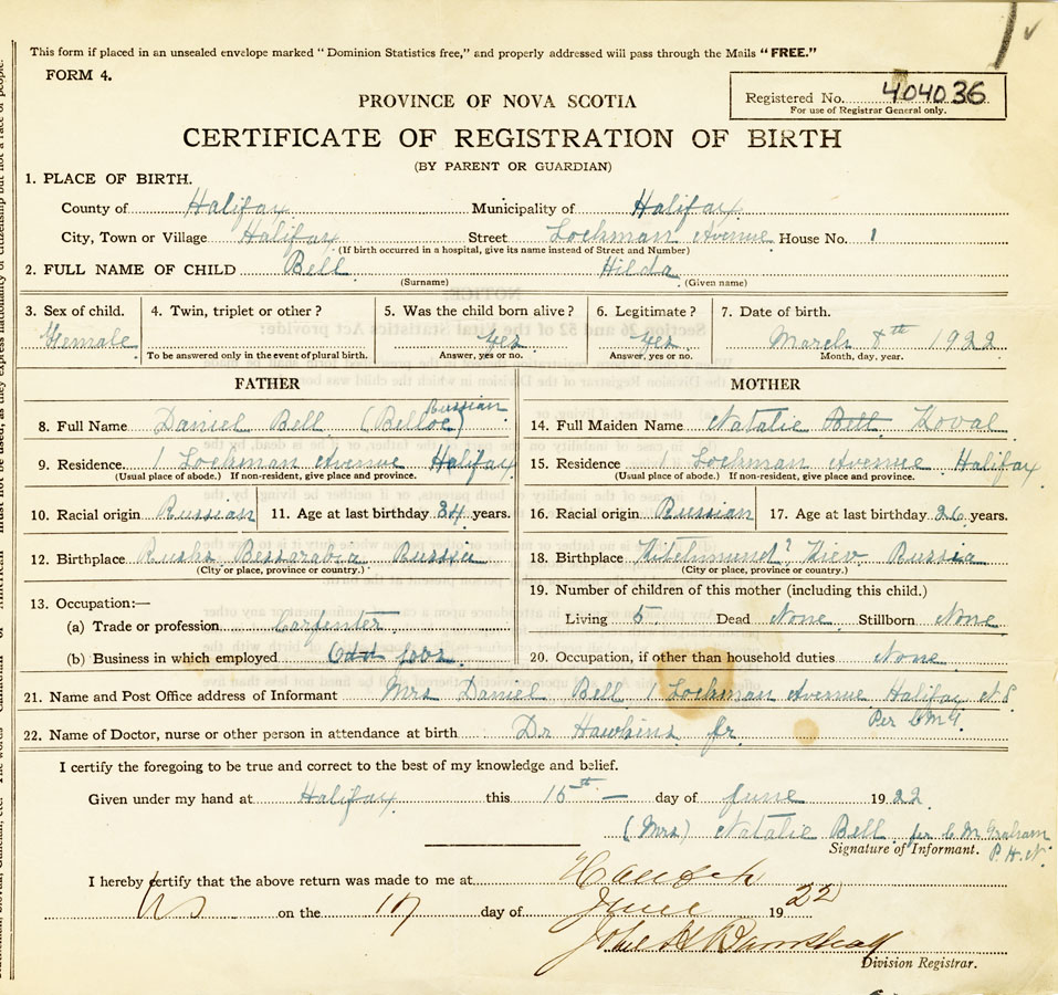21. Name and Post Office address of Informant Mrs Daniel Bell 1 Lockman Avenue, Halifax