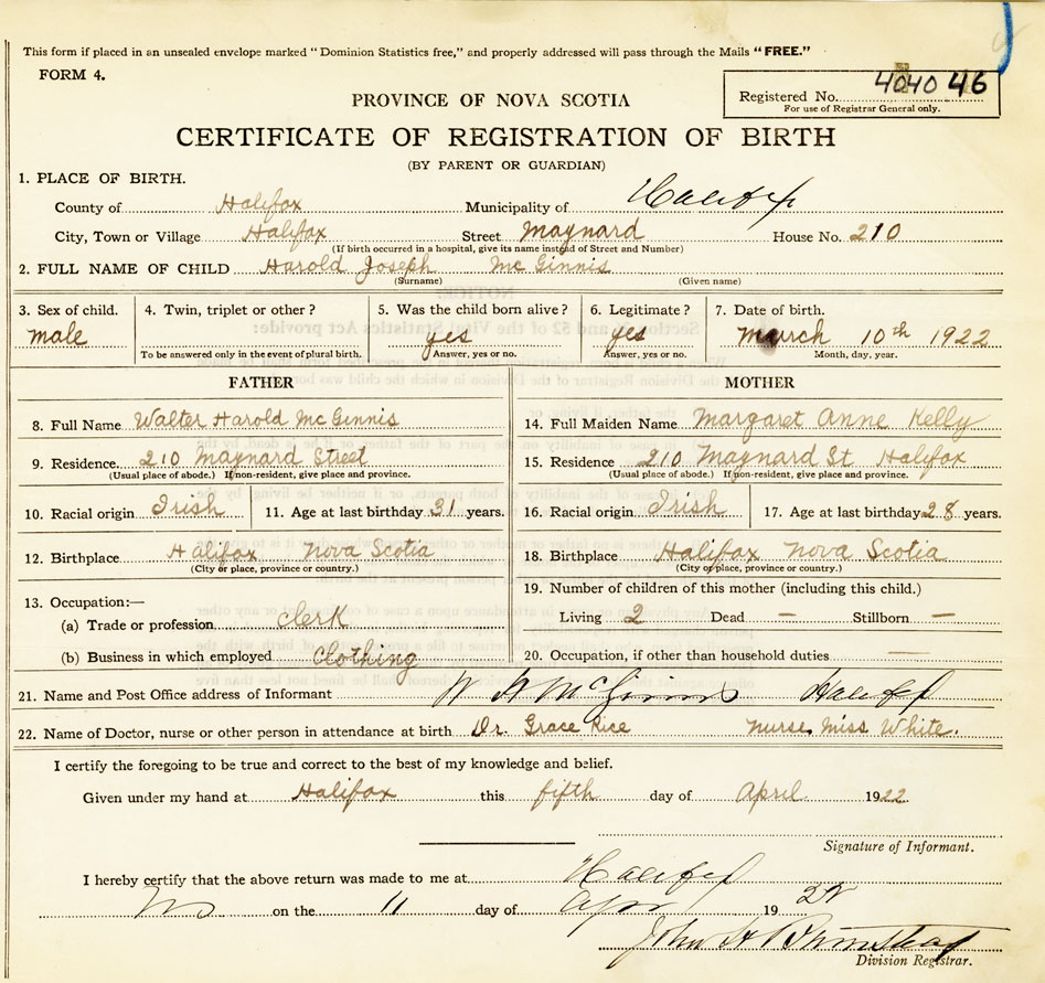 21. Name and Post Office address of Informant W H McGinnis Halifax
