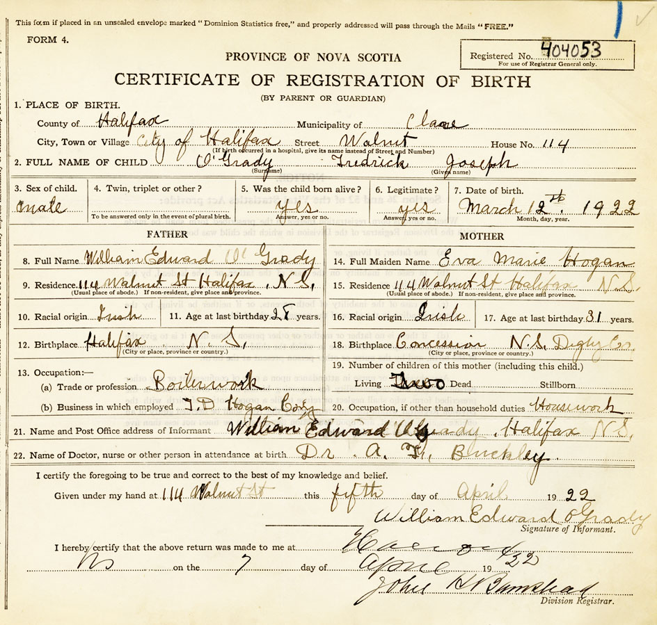 21. Name and Post Office address of Informant William Edward O'Grady Halifax