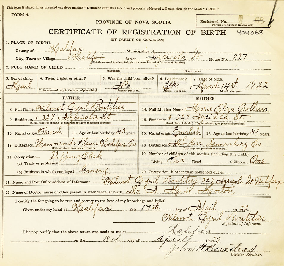 21. Name and Post Office address of Informant Wilmot Cyril Boutilier 327 Agricola St., Halifax
